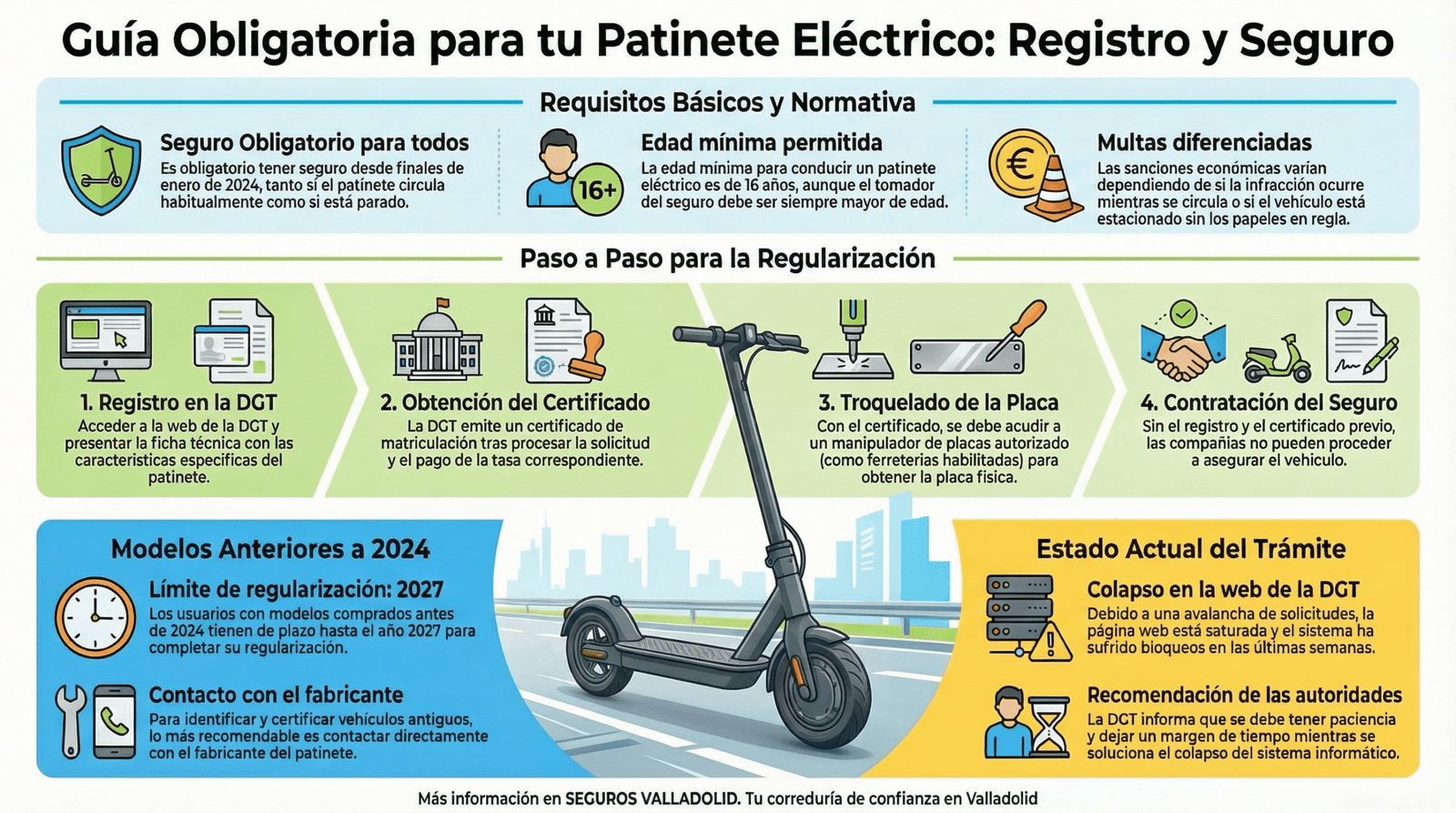 La obligación de registrar y asegurar los patinetes eléctricos ya está teniendo consecuencias visibles. En los últimos días, la elevada demanda de trámites ha provocado problemas de acceso y saturación en la web de la DGT, tal y como recogía una información publicada por CyLTV el 26 de marzo de 2026 en la que aparece una entrevista a «SEGUROS VALLADOLID» para ofrecer más información al respecto.